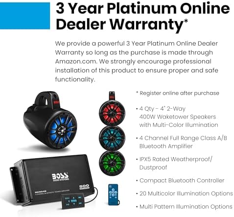 BOSS Audio Systems UNI4RGB ATV UTV Marine Boat IPX5 Weatherproof 4 Inch Stereo Wake Tower Speakers (x4) And 4 Channel Weatherproof Bluetooth Amplifier