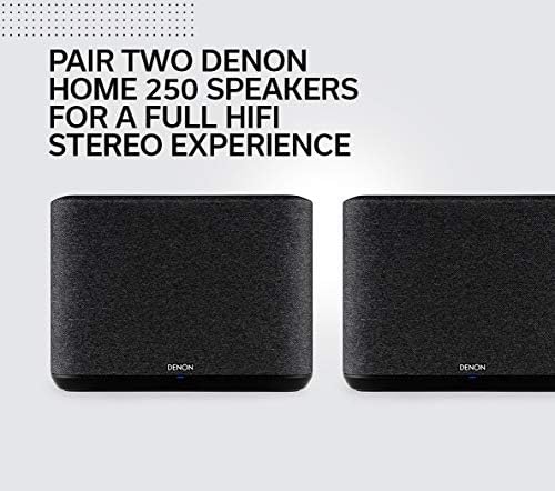 The new Denon Home 250 plays all your music wirelessly in stereo with amazing, expansive sound. Play your favorite online streaming services like Spotify, Apple Music, Amazon Music HD, Pandora, TIDAL and more, or enjoy Hi-Res files stored on your phone or network via Wi-Fi, AirPlay 2 or Bluetooth. Group other products with HEOS Built-in such as AV receivers, Hi-Fi systems, sound bars, and speakers to fill your house with music. Play different music in each room, or group all of your HEOS Built-in devices together to stream the same music throughout your home. Voice control and three presets make it easy for anyone in the family to play their favorite music.