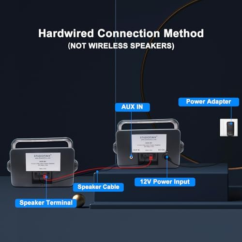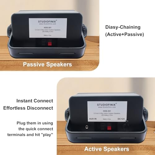 【3.5mm Aux Input Jack】The outdoor wired speakers has a built-in AUX 3.5mm input jack so you can connect additional external devices to your speaker system, such as mobile phone, laptop, computer, home theater, television, CD player,offering a seamless audio experience across multiple devices.